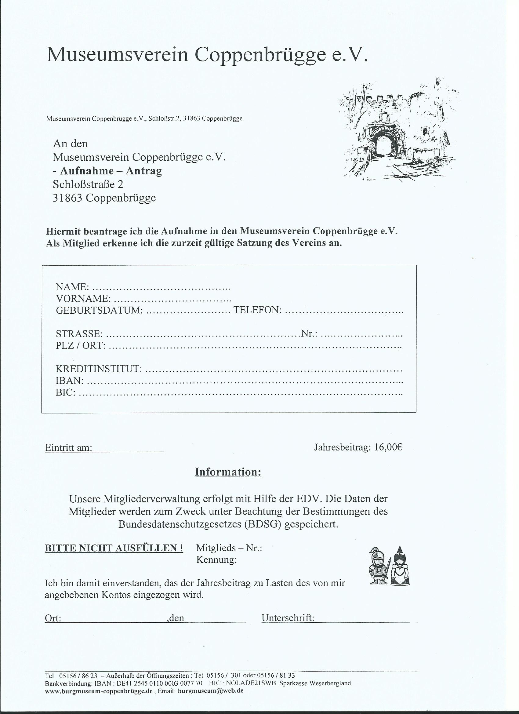 Der Verein Museum in der Burg Coppenbrügge e.V. hat stets die Richtigkeit, Vollständigkeit und Aktualität der in dieser Internetpräsenz bereitgestellten Informationen zum Ziel. Dennoch können Fehler und Unklarheiten nicht ausgeschlossen werden. Für Schäden, die durch die Nutzung der zur Verfügung gestellten Informationen oder Daten oder durch die Nutzung fehlerhafter und / oder unvollständiger Informationen oder Daten verursacht werden, haftet der Museumsverein Coppenbrügge e.V. nicht , sofern ihm nicht vorsätzliches oder grob fahrlässiges Verschulden zur Last fällt. Dieser Ausschluss gilt nicht für Schäden aus der Verletzung des Lebens, des Körpers oder der Gesundheit.